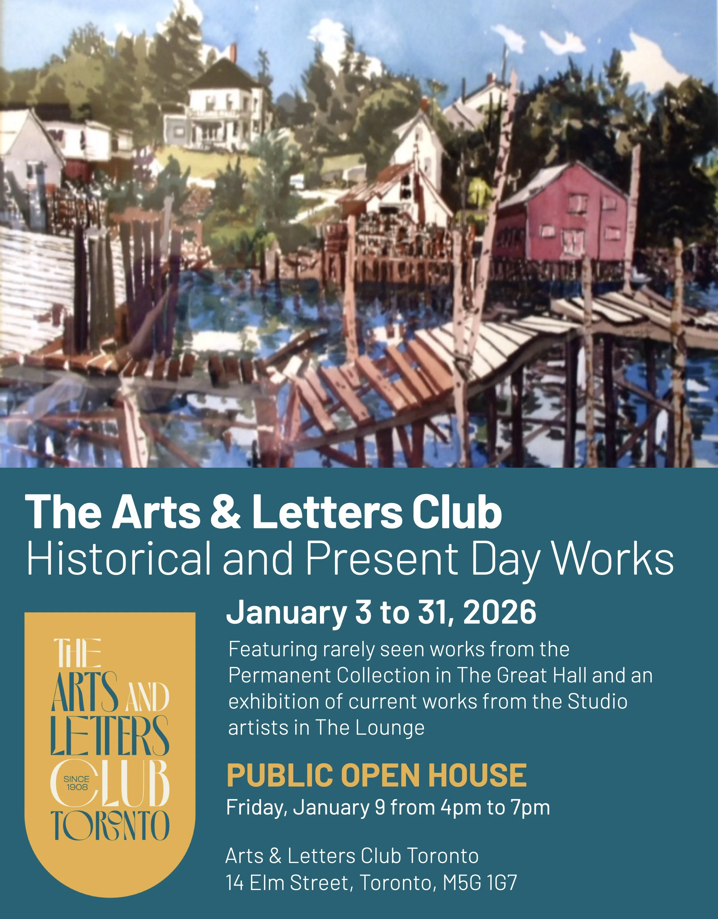 Juried shows of members’ work, most often group shows or solo shows, change every three or four weeks and are displayed on the walls of each the Lounge and the Great Hall. Openings are held on a Friday during public hours from 4 to 7pm.